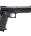 When compared to VORKSs standard 5.1 Hi-Capas, the CS VENGEANCE features a new adjustable rear iron-sight, an extended magazine base plate and the inclusion of a floating BDS option. The slide markings are a new pattern with some forward cut-outs revealing the fluted outer barrel within.